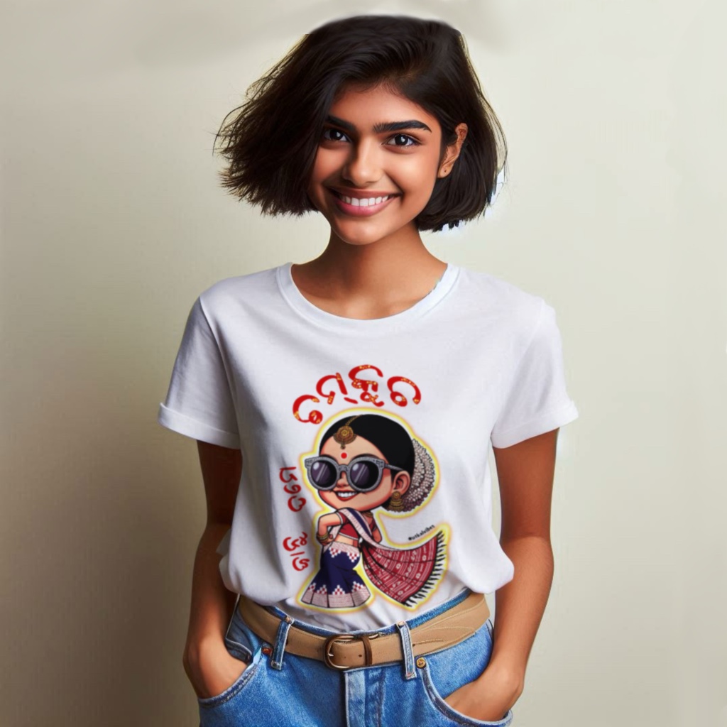 This quirky design reimagines the popular Odia song “Jaanu Tame Chamkucha,” showcasing a traditional Odia woman in a saree rocking stylish sunglasses—a perfect blend of cultural charm and modern swagger!